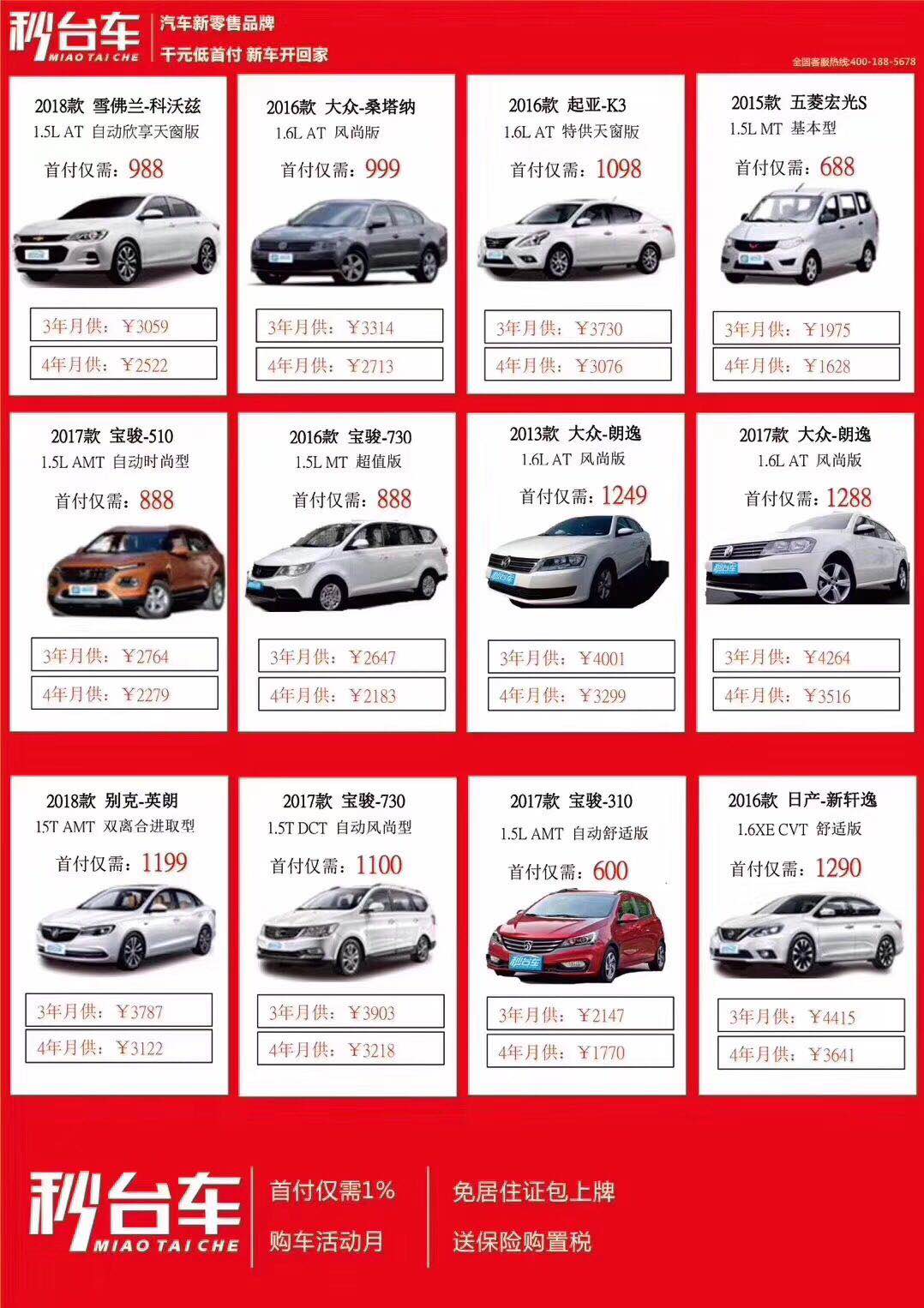 后河集团秒台车 1%最低首付开始了!!! 看准是1% 1% 1% 10万的新车首付只需1000块,13款现车买车的朋友速度了,时间有限 当天提车! 咨询电话18236855507(同微信)抓紧,活动时间1个月 资料简单: ...