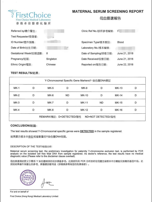 二胎孕妈总算如愿男宝一枚 6月下旬老公陪我去香港验的 当时刚好孕8周,当天抽血送检 第二天中午就出来结果了 现在晒一下报告单,有Y妥妥的男宝哟 ...