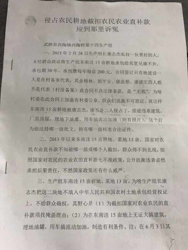 武陟县西陶镇西陶村第十四生产组200多村民联名举报 ——组长康志杰侵占农民耕地截扣农民农业直补款应到哪里诉冤? 土地是农民赖以生存的根本,是农民的命根子。但随着我国城镇化进程和新农村建设的 ...