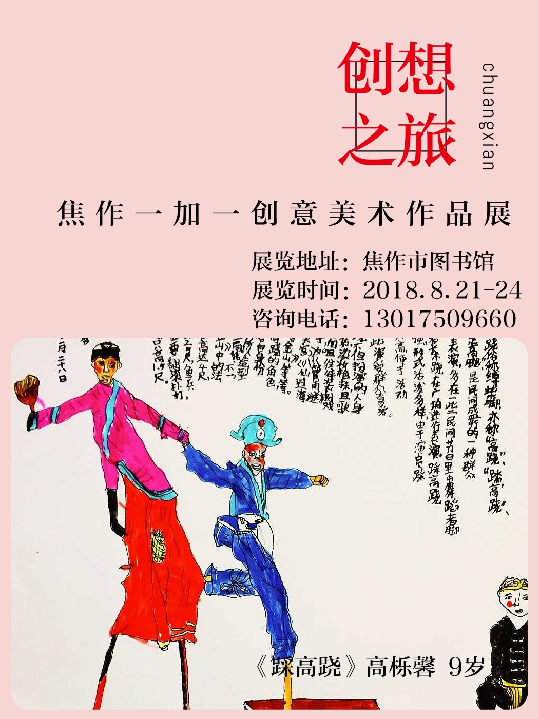 《创想之旅》--焦作一加一创意美术作品展 展览地址:焦作图书馆 展览时间:8.21——24 咨询电话:13017509660