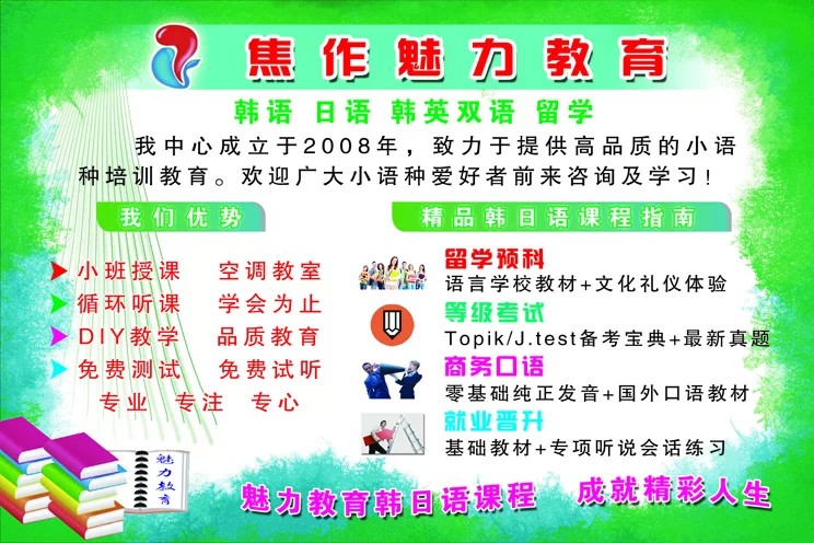 2.韩日语白班,大学放暑假,在人才济济的现代社会,为自己毕业之后早作打算吧,让自己以后的社会道路走得更加轻松! 3.韩日语晚班,结束一天的工作,业余时间大家一起来充电吧!!在这里学到的日语会让你的同事和上司对你刮目相看~ 这里的韩日语学习会让你的业余生活变的更加精彩! 魅力教育 韩语.日语课程! |