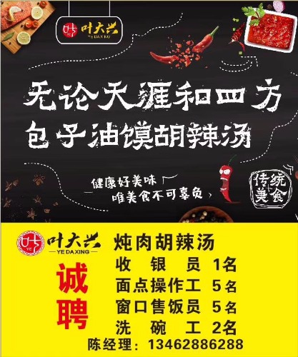全国早餐知名品牌,[叶大兴]炖肉胡辣汤进驻焦作,现诚聘工作人员: 面点操作工5名 窗口售饭员5名 洗碗工2名 收银员1名 工作时间,05:00---11:00 工资:1500---3000 一经录用,待遇从优! 地址:新华街与解放路交叉口 ...