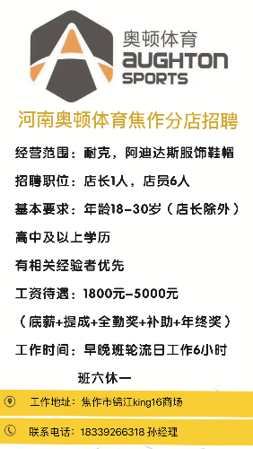 河南奥顿体育焦作分店主营耐克,阿迪达斯鞋帽服饰。 现诚聘以下人员。