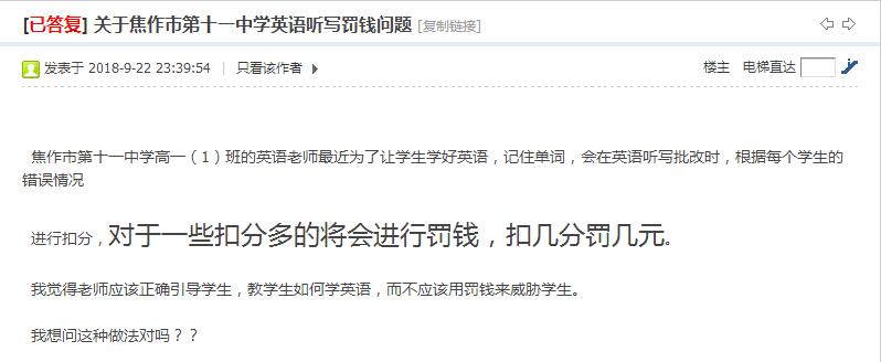| 现在老师权利这么大吗?请先讨论能不能,再讨论对不对。老师如果能随便罚学生钱,那和焦作大街上私自占用公共道路和公共停车位,然后私自收费的人有什么区别?教书育人,可不是这样教的。 |