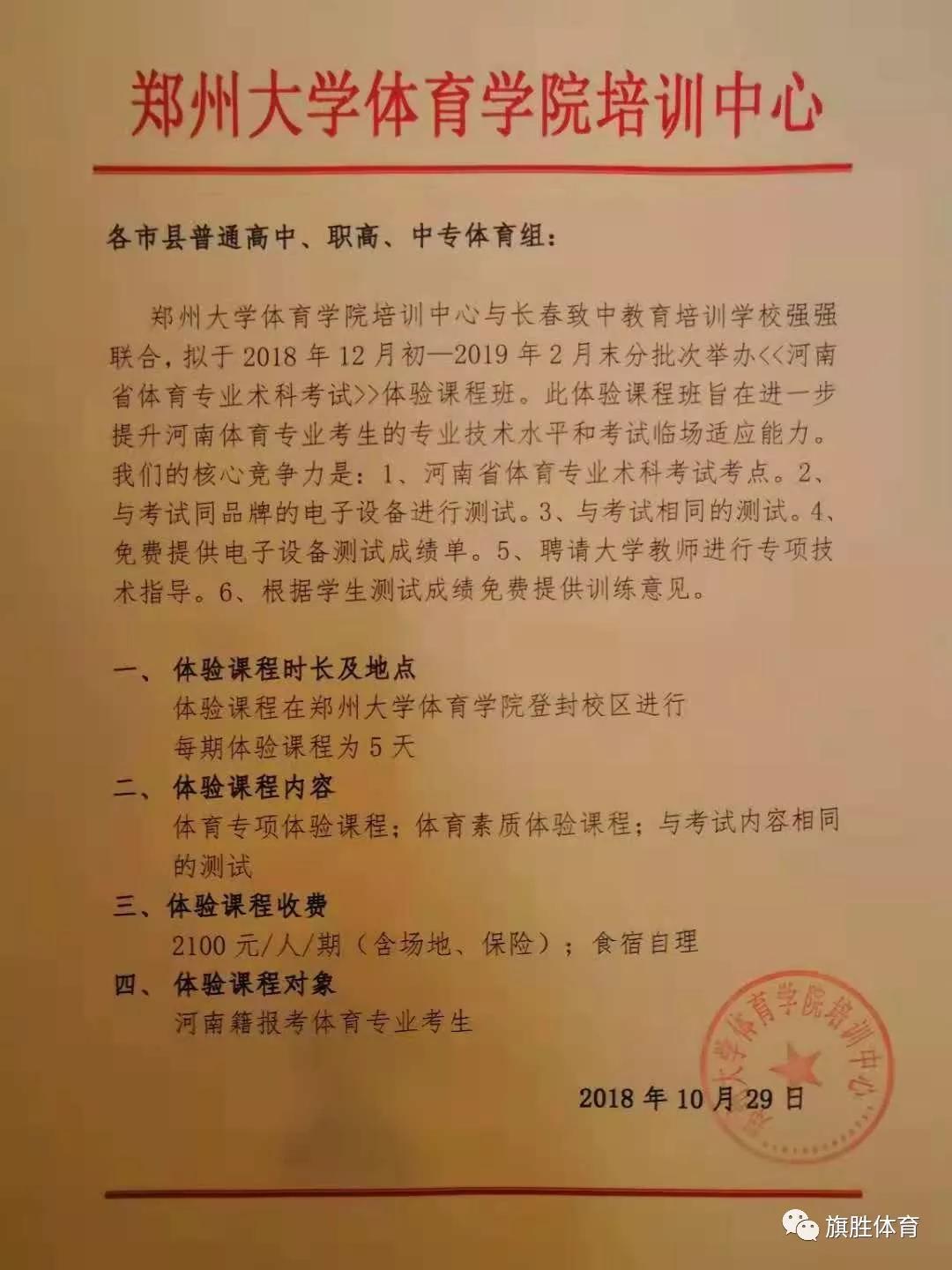 郑州大学体育学院培训中心于长春致中教育培训学校强强联合,拟于2018年12月1号——2019年2月末分批次举办《河南省体育专业术科考试》体验课程班。此体验课程班旨在进一步提升河南体育专业考生的专业技术水平和考试临 ...