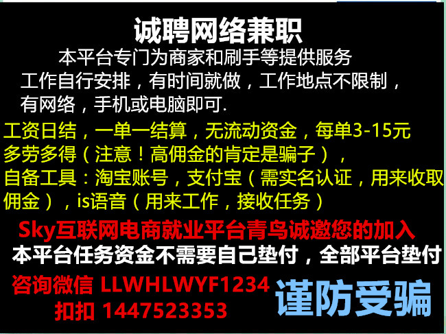 任职资格: 一、男女不限,18-50岁,无经验可培训! 二、为人诚实守信,善待他人,吃苦耐劳; 三、要细心,有耐心,工作认真、负责,有问题及时反馈; 四、要求懂得简单的软件操作、对网络有一定的兴趣,扎实勤恳,有良 ...