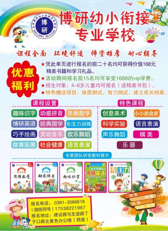 本帖最后由 wx2033997 于 2019-5-16 15:33 编辑 焦作博研幼小衔接专业学校是由北京博研衔接教育科技有限公司焦作分公司创办的一所专注于3-6岁的专业教育机构。博研学校集教学、寝室、就餐于一体,功能齐全,环境 ...