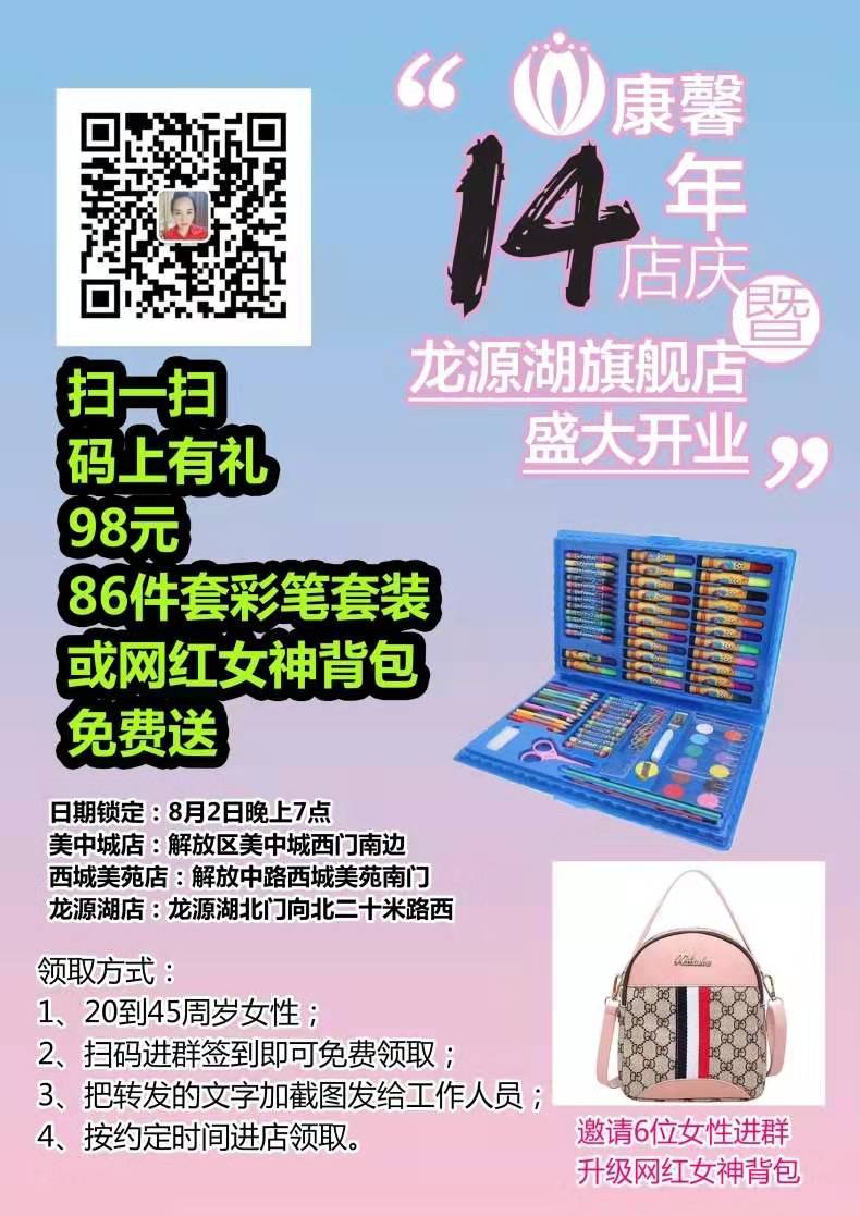 大家期待已久的康馨14周年四店同庆活动福利群终于来了‼️ 8月2号晚7点大型活动来袭 特推出福利免费放送价值98元86件套水彩笔或者 ...