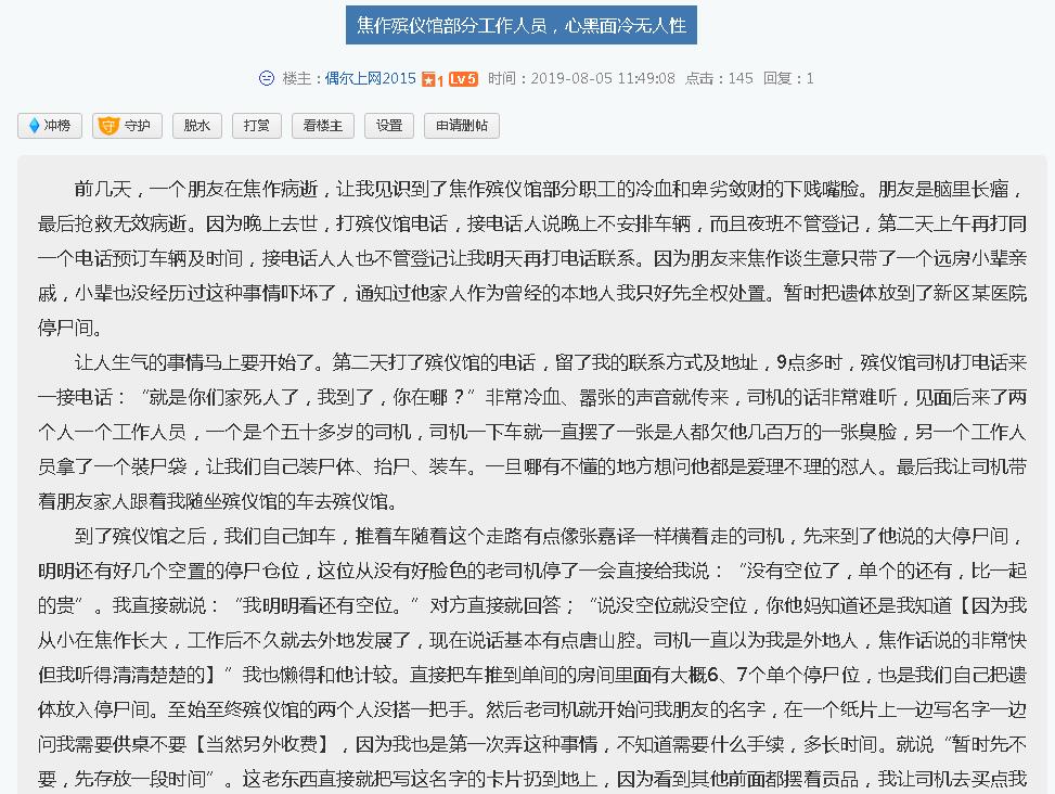 | 非常高兴看到,焦作市殡仪馆这么快的反应,只是我人已不在焦作,这个账号还是朋友的,我本人祖籍焦作,父母也在焦作养老。虽然不在焦作出生,但是我的整个小学到高中,乃至工作的前几年都是在焦作。我也希望自己的家乡不管什么环境都越来越美。此次的时间中,我只能说那个年龄大约50多岁的老司机或者叫师傅吧,我也不知道叫什么反正说话太难听了,他手机尾号应该是7933,希望对你们有帮助。另外那两个撤花的女工作人员我是真没印象,鬼一样的飘进飘出,但是那句话实在是太伤人了,亲友过世本身身边就没个人,空旷的大厅寒心的话语,真是字字如刀。我只希望我的父母有朝一日再去贵地的话,希望我能不再面对这些冰冷的面孔,如刀的话语。 |