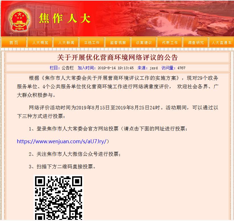 投票地址:https://www.wenjuan.com/s/aU7Jry/ 焦作市政务部门、公共服务单位优化营商环境工作满意度评议! 焦作市 ...