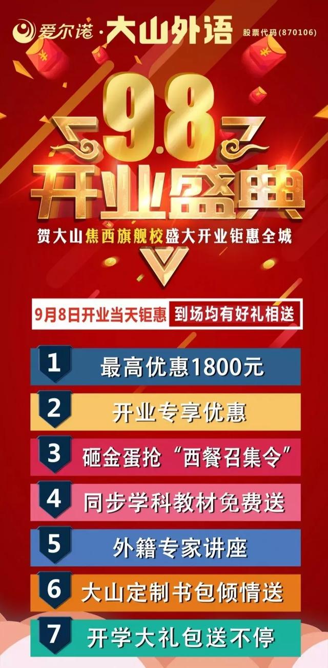 你知道吗? 大山外语又有一家新校区即将开业?就在 9月8日 ! 爱尔诺·大山外语焦西旗舰校盛大开业! 开业钜惠!力度空前!开业当天凡到场者均有好礼相送!现场报名最高可优惠1800元!还可砸金蛋,抢“西餐 ...