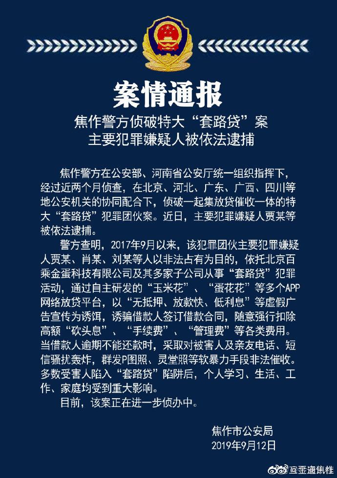 【焦作警方通报百乘“套路贷”案:涉及“玉米花”、“蛋花花”等多个APP】据平安焦作官方微博披露,日前,焦作警方侦破一起集放贷催收一体的特大“套路贷”犯罪团伙案。主要犯罪嫌疑人贾某等被依法逮捕。 警方查明, ...