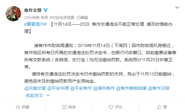 【11月14日—25日 焦作交通违法不能正常处理 请及时提前办理】 接焦作市财政局通知:2019年11月14日(下周四)因市财政局机房搬迁,焦作地区所有已开具的交通违法处罚决定书,在银行代收窗口 ...