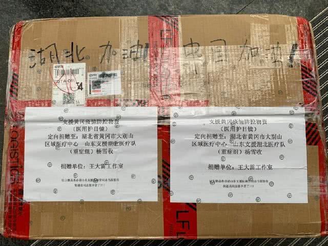 王大雷捐赠护目镜抵达黄冈,医护人员手持标语为鲁能加油