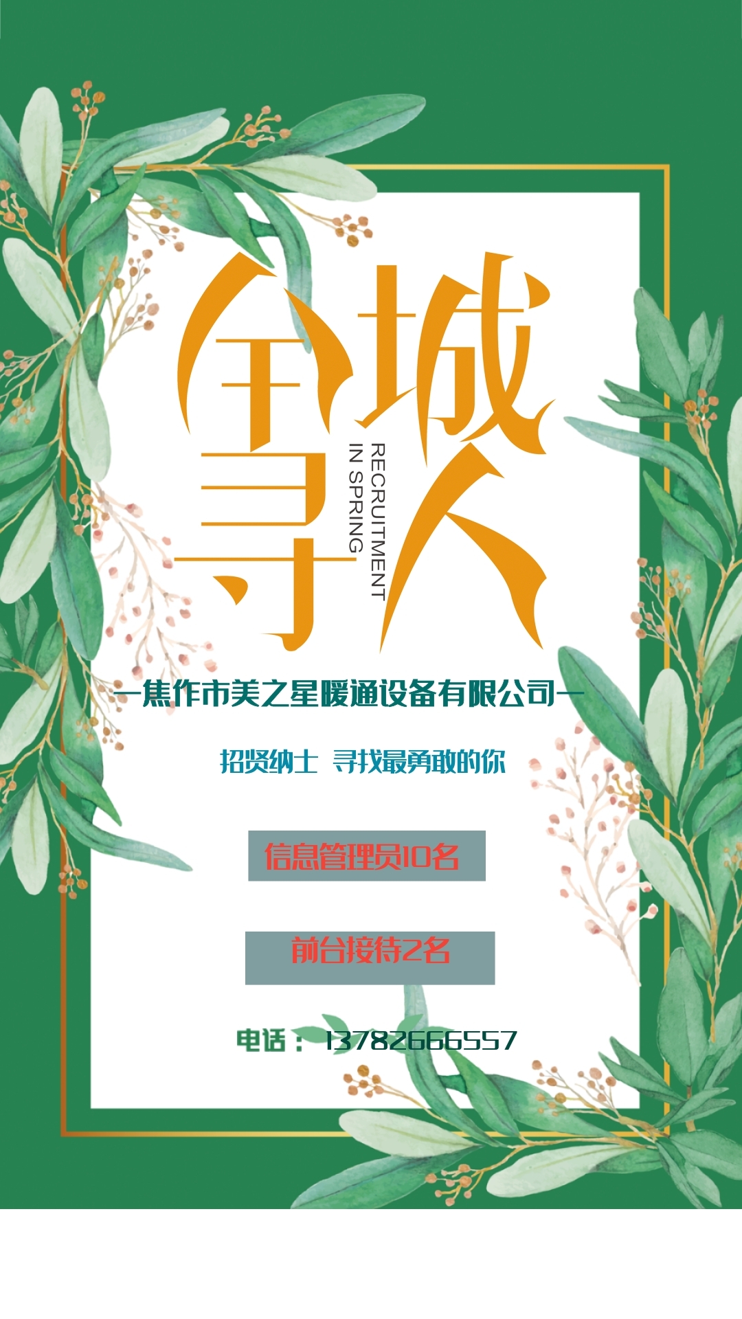 招聘信息专管员10名、前台接待2名