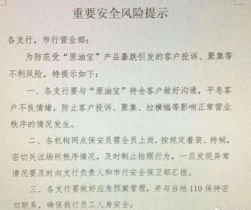 原油宝炸了! 中行感到了前所未有的巨大压力!紧急通知员工注意人身安全! 具体举措还包括: 1、防范客户聚集; 2、保安全员值班; 3、制止拍照行为; 4、做好应急预案;   5、随时联系警方。 ...