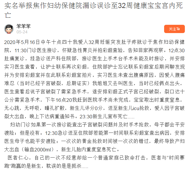 在医患关系有些缓解的大背景下,焦作妇幼是逆行而上啊!傲慢、不作为、乱作为层出不穷,这不是一个医生的问题,是整个医院的医风医德有很大的问题!这不是整改能解决的问题,应该进行整肃了!!! |