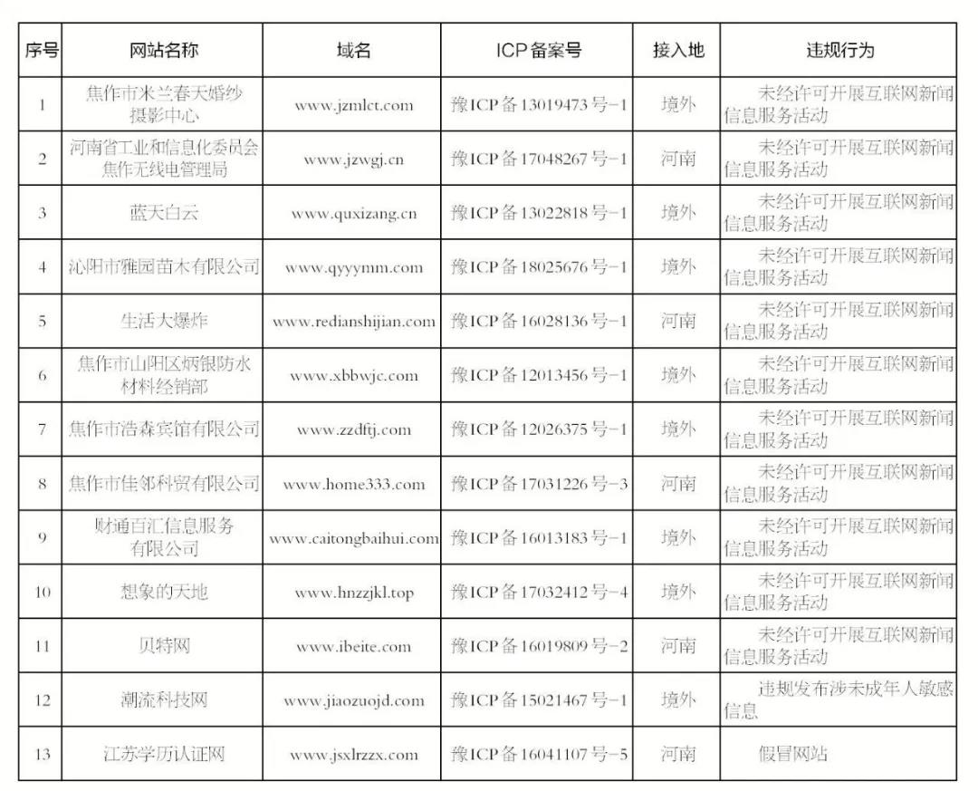 焦作市互联网信息办公室关于依法处置13家属地互联网站的公告 根据国家网信办《网络信息内容生态治理规定》要求,焦作市互联网信息办公室集中开展属地互联网站信息内容全面排查工作,扎实推进“清朗行动”取得实效。 ...