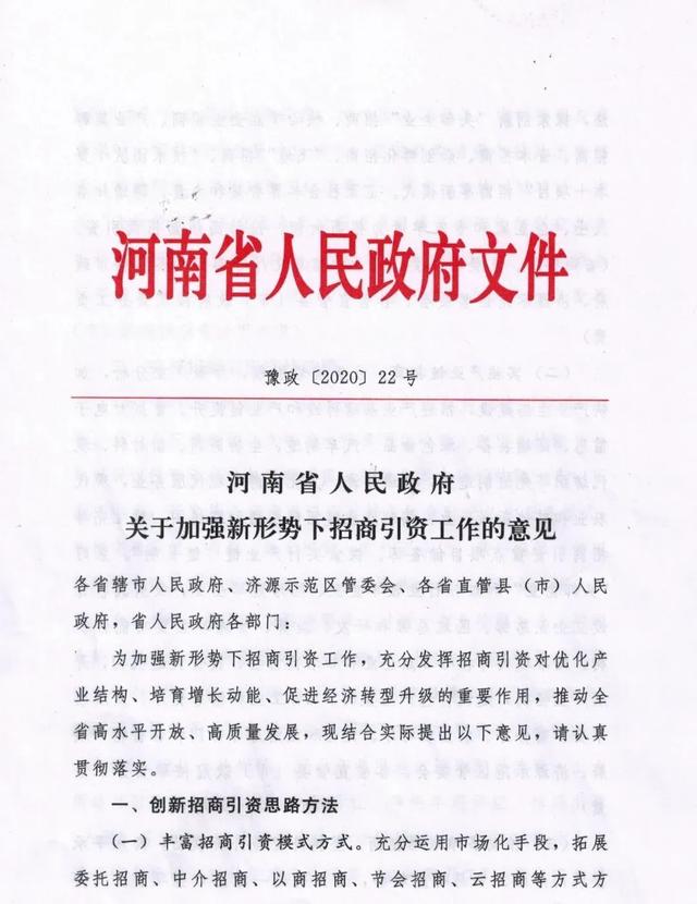 河南省人民政府关于加强新形势下招商引资工作的意见 为加强新形势下招商引资工作,充分发挥招商引资对优化产业结构、培育增长动能、促进经济转型升级的重要作用,推动全省高水平开放、高质量发展,现结合实 ...