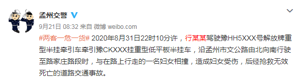 近日,焦作温县交警、武陟交警、孟州交警发布了三例典型交通事故案例,造成3人死亡,希望大家出行注意安全,珍重生命! 孟州一妇女经抢救无效死亡 2020年9月17日,武陟县道路运输管理局作出决定,对未履行企业主 ...