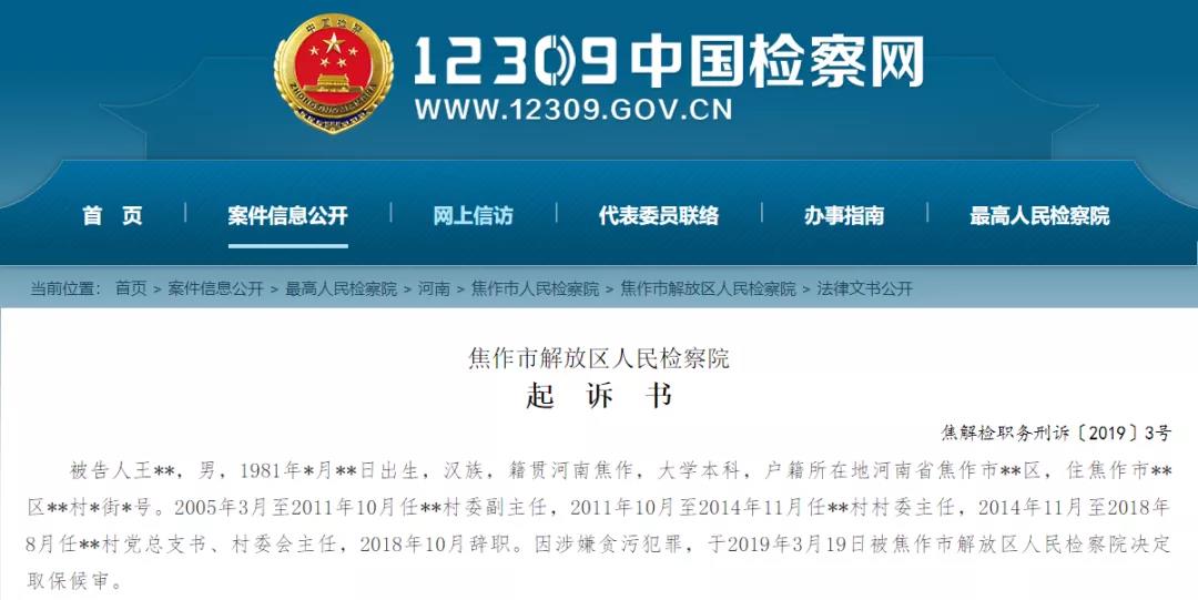 近日,据中国检察网获悉:焦作王某某利用担任焦作市**区**村党支部书记、村委会主任的职务便利,贪污国家拆迁补偿款共计697442.4元。因涉嫌贪污犯罪,于2019年3月19日被焦作市解放区人民检察院决定取保候审。 焦 ...