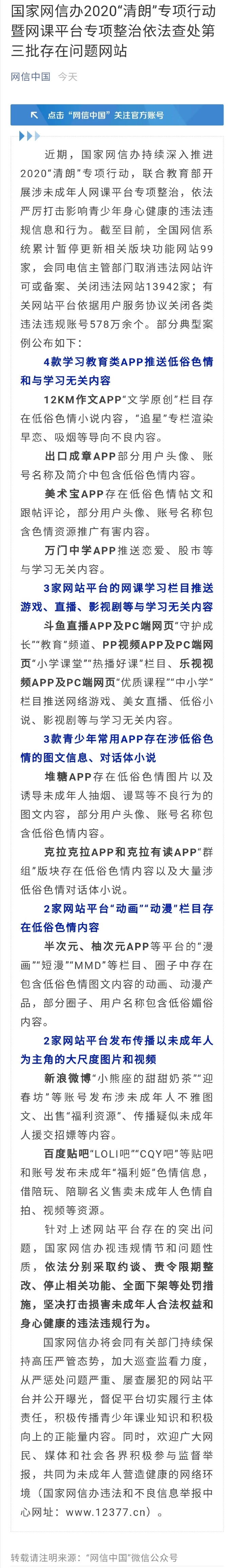 近期,国家网信办持续深入推进2020“清朗”专项行动。截至目前,累计暂停更新相关版块功能网站99家。国家网信办视违规情节和问题性质,依法分别采取约谈、责令限期整改、停止相关功能、全面下架等处罚措施。 ...