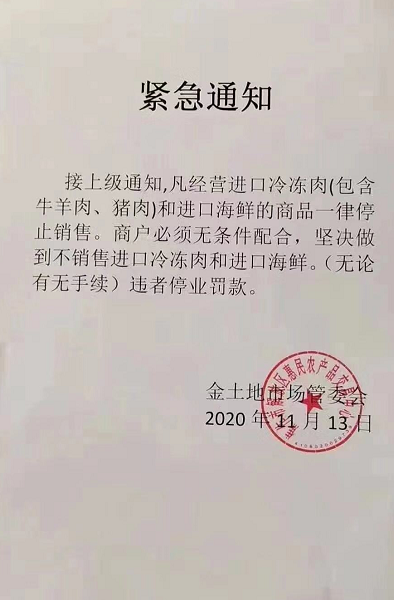紧急通知 广大居民请注意: 凡于11月11日-14日在金土地农贸市场“买亮牛羊鸡鸭副产批发”店铺购买过牛肉的居民,请立即与所在社区联系报备,同时做好个人防护,到医院做核酸检测。并自觉居家隔离观察7天(从11月11日 ...
