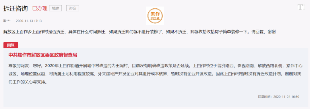 据领导留言板获,焦作解放区上白作村是否拆迁问题得到明确答复,上白作村地理位置优越,村所属土地利用程度较高,外来房地产开发企业对其进行成本核算,暂时没有企业开发改造...... 中共焦作市解放区委区政府督 ...
