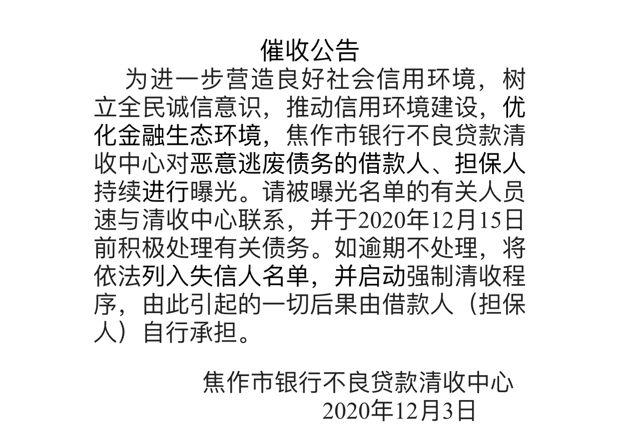 催收公告 为进一步营造良好社会信用环境,树立全民诚信意识,推动信用环境建设,优化金融生态环境,焦作市银行不良贷款清收中心对恶意逃废债务的借款人、担保人持续进行曝光。请被曝光名单的有关人员速与清收中心联 ...