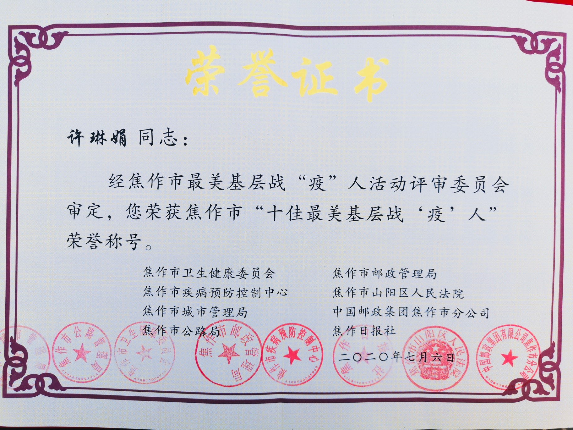 焦作市学雷锋志愿者协会会长许琳娟同志: 经焦作市最美基层战“疫”人活动评审委员会审定,您荣获焦作市“十佳最美基层战‘疫’人”荣誉称号。 焦作市卫生健康委员会 ...