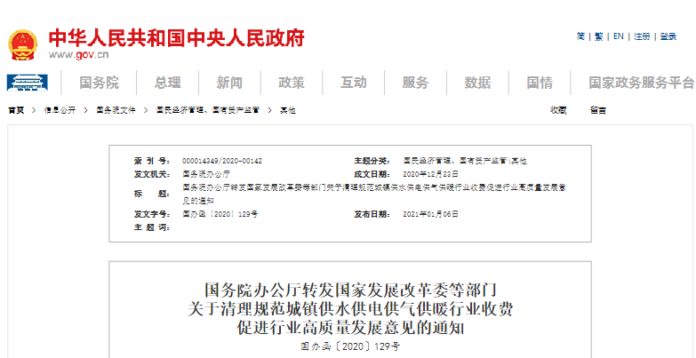 来源:中国政府网 国务院办公厅转发国家发展改革委等部门关于清理规范城镇供水供电供气供暖行业收费促进行业高质量发展意见的通知 国办函〔2020〕129号 各省、自治区、直辖市人民政府,国务院各部委、各直属机构 ...