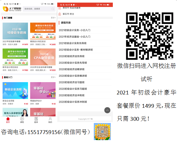 初级会计:小白入门班+先导班+精讲班+习题班+冲刺班。原价1499元课程,现在仅需300元; 咨询电话:15517759151(微信同号);15517759156(微信同号) ...