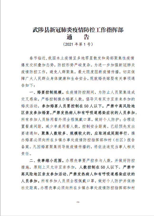 武陟县新冠肺炎疫情防控工作指挥部通 告(2021 年第1 号) 春节临近,我国本土疫情呈多地零星散发和局部聚集性疫情爆发交织叠加态势,防控形势严峻复杂。为进一步加强新冠肺炎疫情防控工作 ...