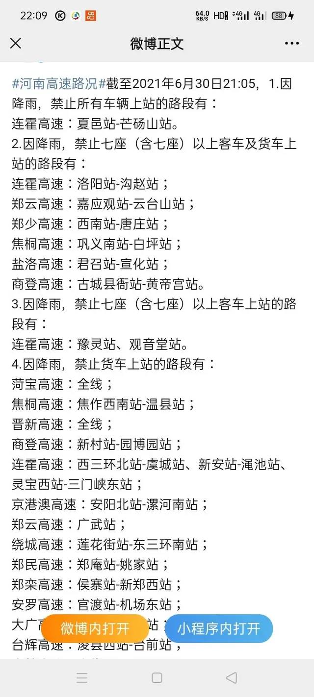 截止2021年6月30日22时,因降雨影响,河南省部分高速暂时封闭,禁止车辆上站,其中包括焦桐高速、晋新高速(途经焦作)等。