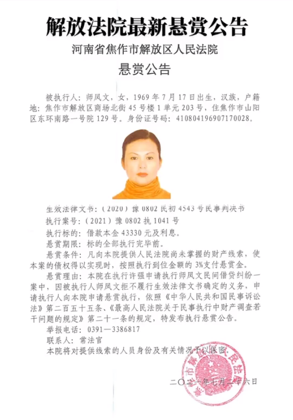 本帖最后由 柠檬的向日葵 于 2021-7-28 17:17 编辑 焦作解放区人民法院发布最新悬赏通告,因被执行人师凤文拒不履行生效法律文书确定的义务,申请执行人向本院申请悬赏执行... 焦作发布悬赏通告 河南省焦作市解 ...