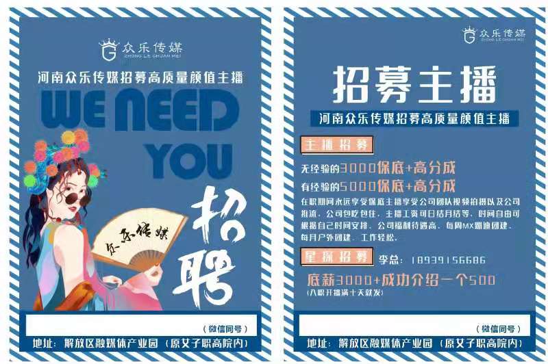 河南众乐传媒招募高质量颜值主播! 主播招募: 招募抖音颜值主播保底4000-6000元,工资日结,提成日结,解决疫情无法工作挣钱的烦恼,当日直播当日收益,可在家直播。公司提供设备,工作轻松,提成最高。 市场专员 ...
