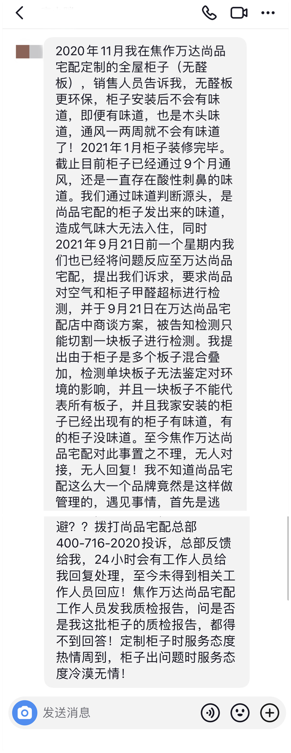 今天,有焦作网友私信山阳论坛小编,反映自己在焦作尚品宅配万达门店定制的全屋柜子(无醛板)在通风9个月后仍有酸性刺鼻味道,而当初定制柜子的时候,门店销售人员却说无醛板做的柜子安装后通风一两周就不会有味道 ...