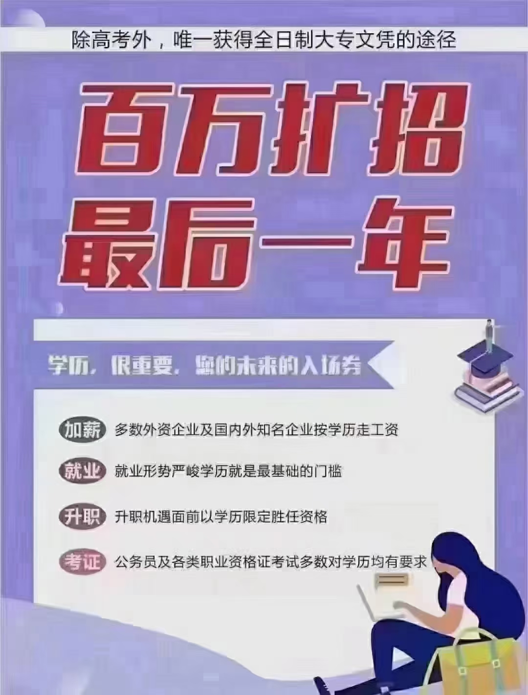 21年高职扩招即将开始! 统招大专学历【高职扩招】 毕业证书+报到证+学信网查询。 专业齐全,全日制专科学历。 近期出文件,现在预订名额 19939178924 ...