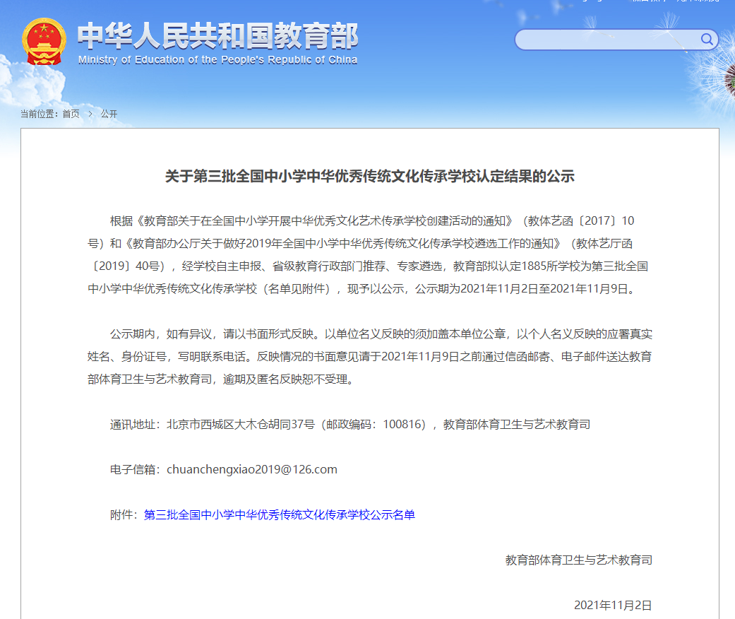 本帖最后由 柠檬的向日葵 于 2021-11-5 09:03 编辑 焦作这些学校被教育部选中!正在公示 ▲点击查看详情 日前 教育部发布公示拟认定 1885所学校为 第三批全国中小学 中华优秀传统文化传承学校 公示期为2021年1 ...