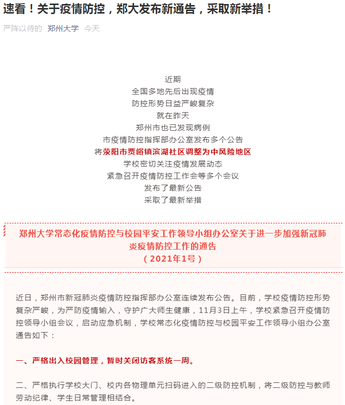 近日河南省多所高校发布通知针对当前疫情采取新举措! 郑州大学 严格出入校园管理;全体师生佩戴口罩,做好个人防护;学生非病假不出校园,按照宿舍、教室、食堂固定路线进行校内活动;“三保”人员实行校园封闭式管 ...