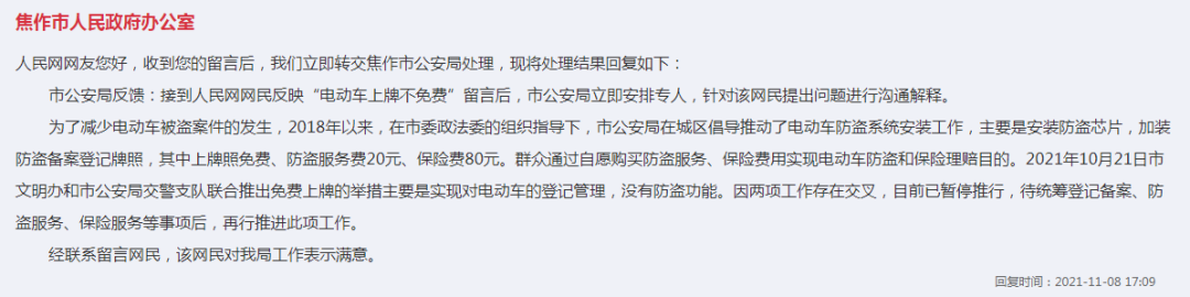 人民网网友您好,收到您的留言后,我们立即转交焦作市公安局处理,现将处理结果回复如下: 市公安局反馈:接到人民网网民反映“电动车上牌不免费”留言后,市公安局立即安排专人,针对该网民提出问题进行沟通解释 ...