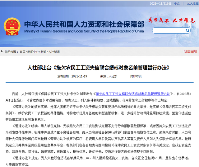 本帖最后由 柠檬的向日葵 于 2021-11-22 10:36 编辑 据人社部网站消息,日前,人社部依据《保障农民工工资支付条例》制定出台《拖欠农民工工资失信联合惩戒对象名单管理暂行办法》,自2022年1月1日起施行。 ...