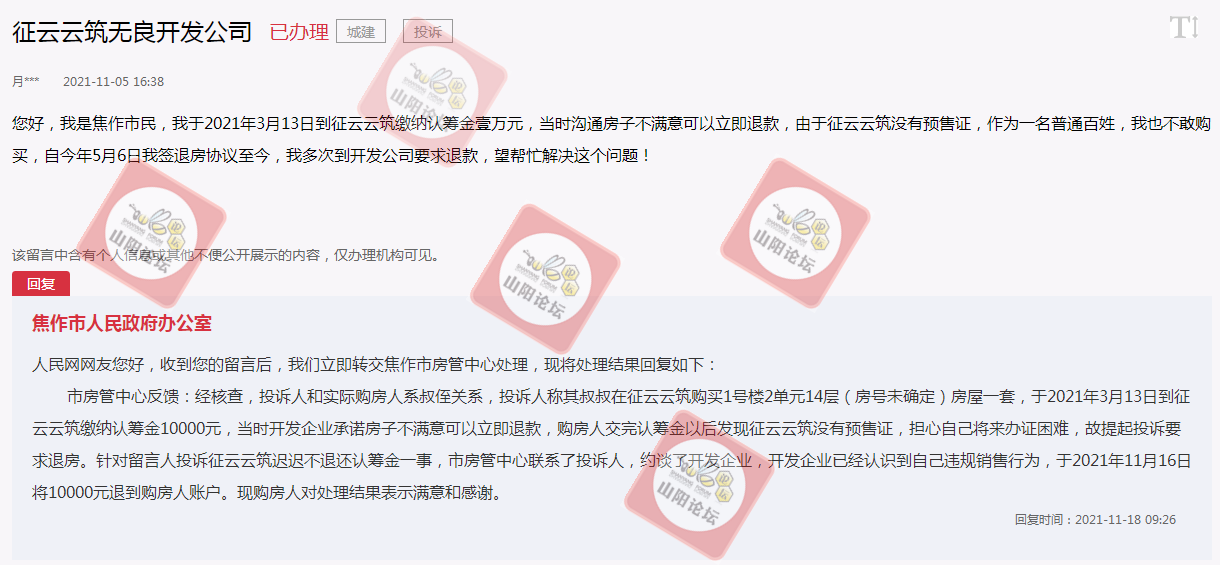 买房一直是关乎民生的大事,然而有些时候,买房带给老百姓的不是幸福,而是无尽的担忧与麻烦...近日,两位市民接连发帖投诉:焦作征云云筑没有预售证却提前搞“认筹”活动,现在老百姓要求退款开发商却迟迟不肯解决 ...