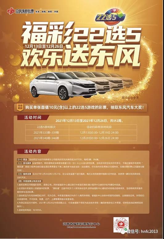 买福彩,抽汽车,为回馈广大彩民对福彩事业的支持,12月13日至12月26日,河南省福彩中心开展“福彩22选5,欢乐送东风”活动,期间凡购买福彩“22选5”且符合条件的,均有机会赢取汽车大奖。   ...