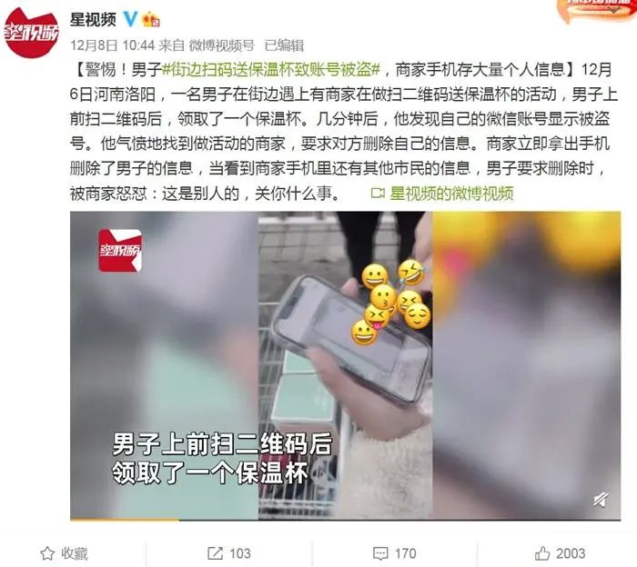 你有没有在大街上遇到过 用一些小礼物“诱惑”你扫码的活动? 近日,河南一名男子在街边遇上有商家在做扫二维码送保温杯的活动,男子上前扫二维码后,领取了一个保温杯。几分钟后,他发现自己的微信账号显示被 ...