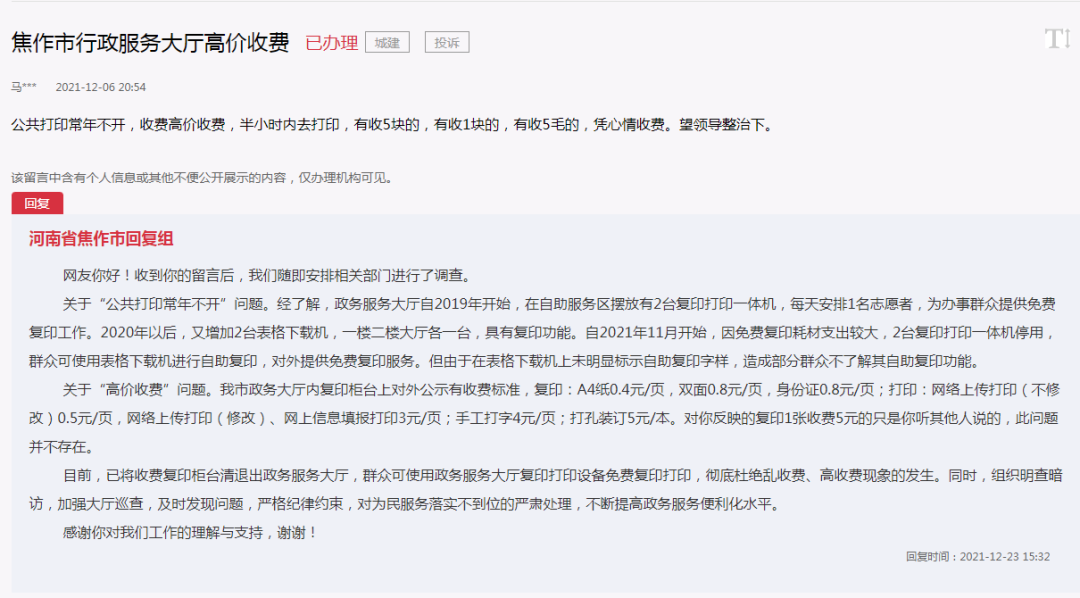 有网友反映焦作行政服务大厅免费的打印机常年不开收费的打印机收费价格混乱且价格高?近日,焦作回复组回应了相关质疑 清退! 公共打印常年不开,收费高价收费,半小时内去打印,有收5块的,有收1块的,有收5毛的 ...