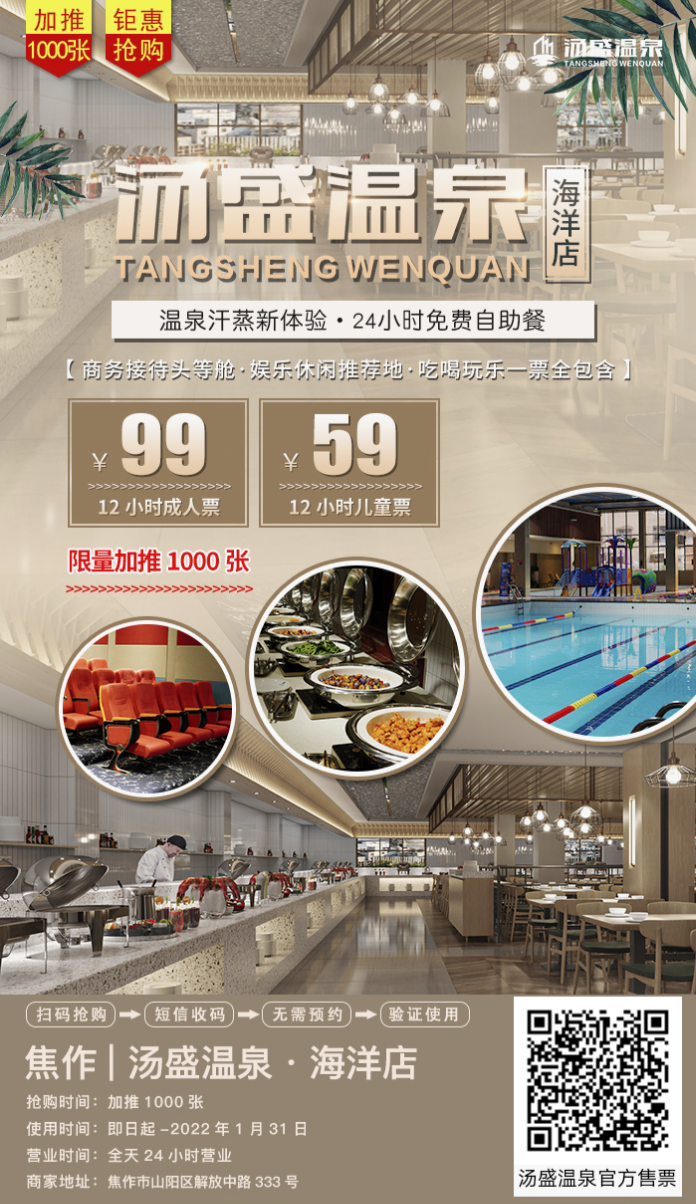 冬天的快乐都是汤盛温泉给的 [烟花]海洋店99 汤乐宫汗蒸馆99 万盛水城店89 12小时狂欢模式,吃喝玩儿乐 遛娃儿,团建,家庭聚会一站式 扫描下 ...