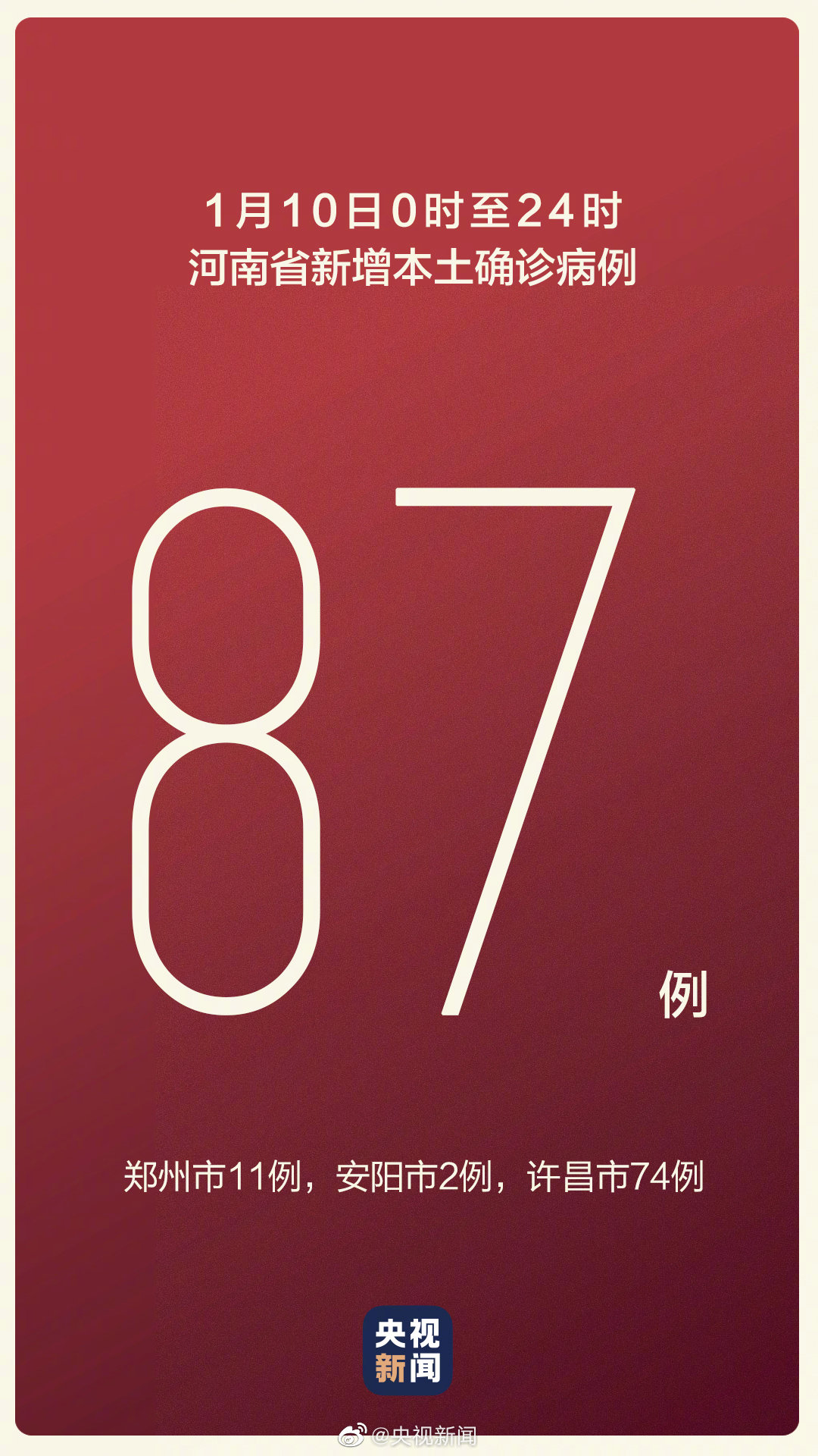 据河南省卫生健康委,1月10日0—24时,河南全省新增本土确诊病例87例(郑州市11例,安阳市2例,许昌市74例);新增境外输入无症状感染者转确诊病例1例;无新增无症状感染者和疑似病例;2例本土确诊病例治愈出院。 ...