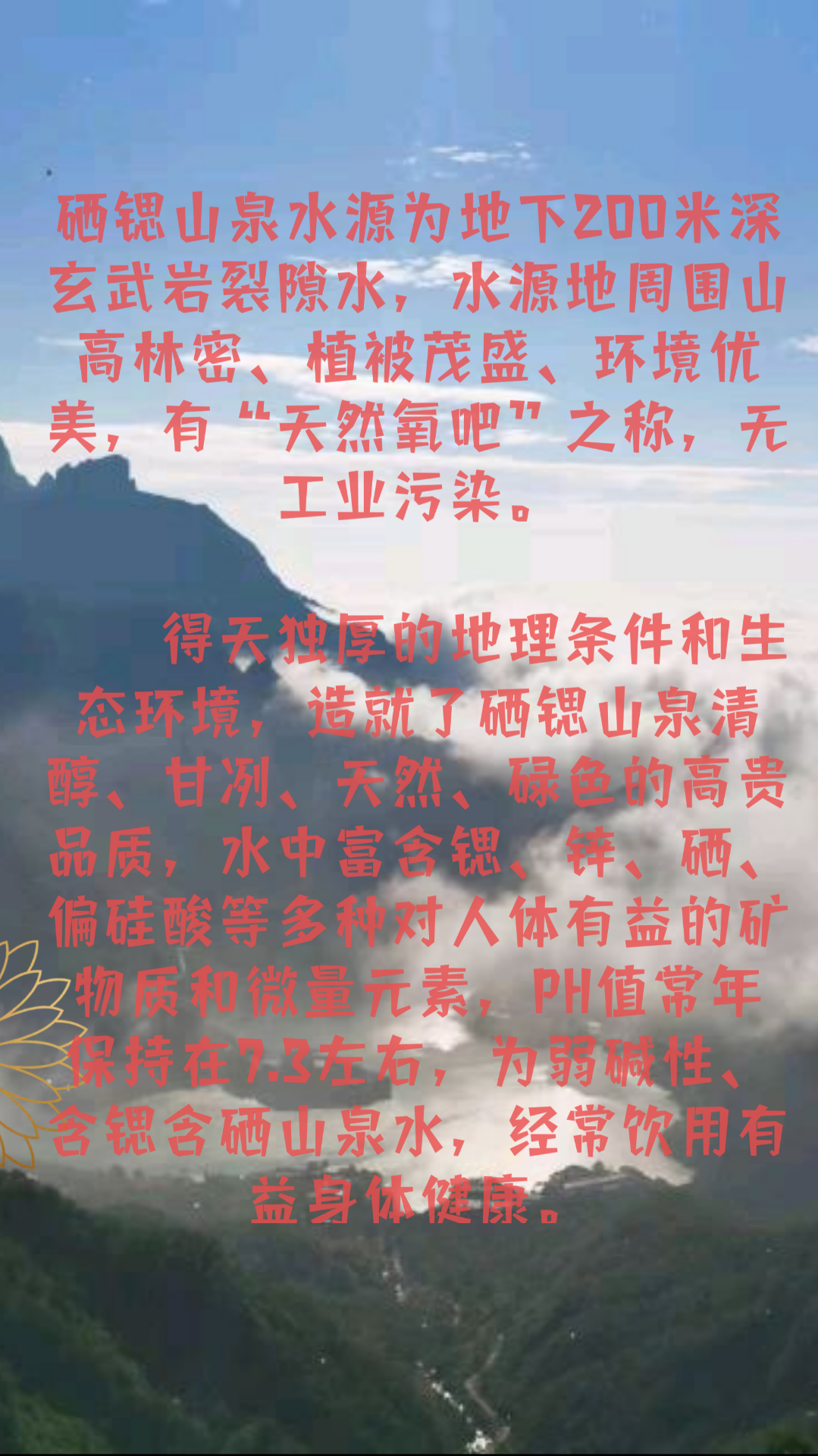 硒锶山泉水源为地下200米深玄武岩裂隙水,水源地周围山高林密、植被茂盛、环境优美,有“天然氧吧”之称,无工业污染。   得天独厚的地理条件和生态环境,造就了硒锶山泉清醇、甘冽、天然、绿色的高贵品质,水中 ...