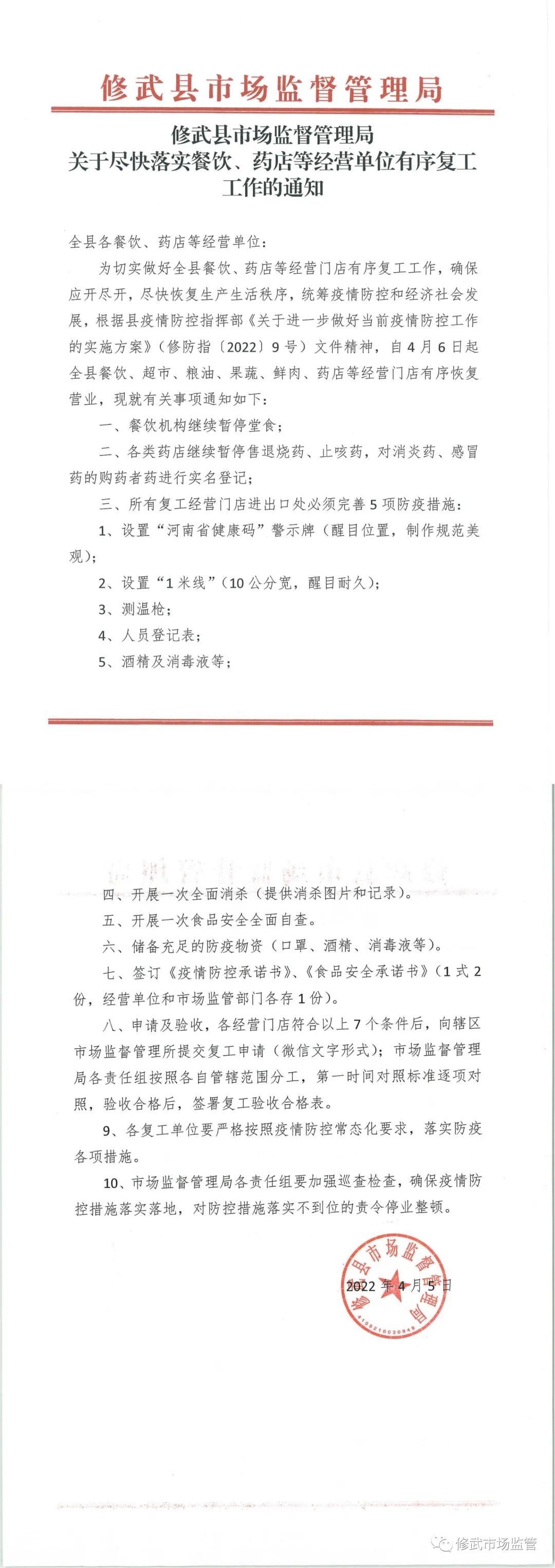 4月5日下午,修武县市场监管局党组第一时间落实县疫情防控工作会议精神,按照应开尽开、尽快复工、简化程序、严格标准的原,制定出台《修武县市场监督管理局关于尽快落实餐饮、药店等经营单位有序复工工作的通知》, ...